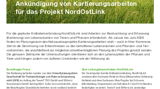 Bekanntmachung der TenneT TSO GmbH - Ankündigung von Kartierungsarbeiten für das Projekt NordOstLink